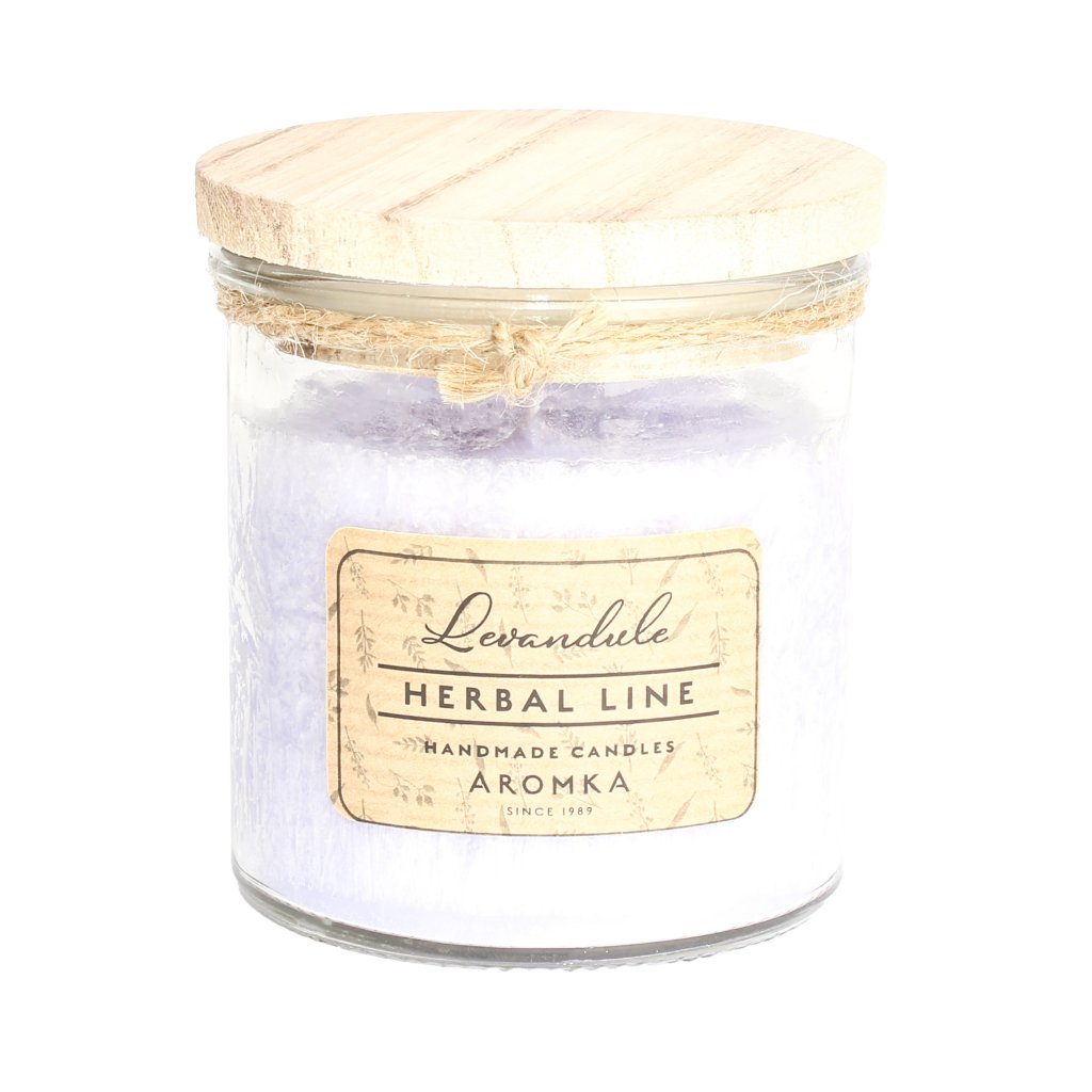 Přírodní vonná svíčka palmová - AROMKA - Svíčky s vůni bylinek - Recyklované sklo, s dřevěným víčkem200 ml - Levandule